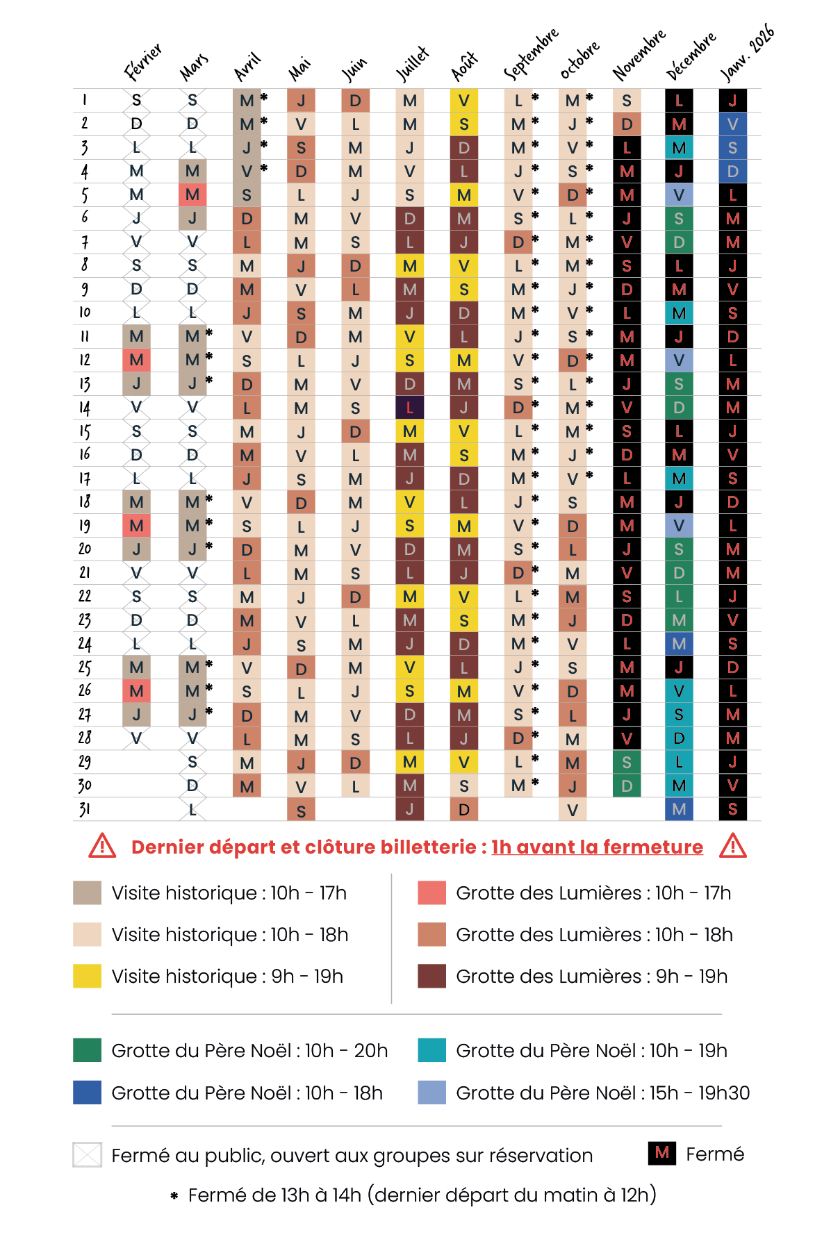 Départ en visite : toutes les 10 à 25 min. selon le type de visiteDernier départ : 1h avant la fermeture du site.