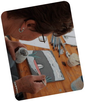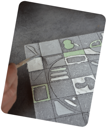 Technique utilisée : méthode du « cloisonné ». Il s’agit de créer son dessin au crayon sur une plaque en Pierre de Volvic préalablement « engobée », puis d’appliquer les émaux de couleur au pinceau.