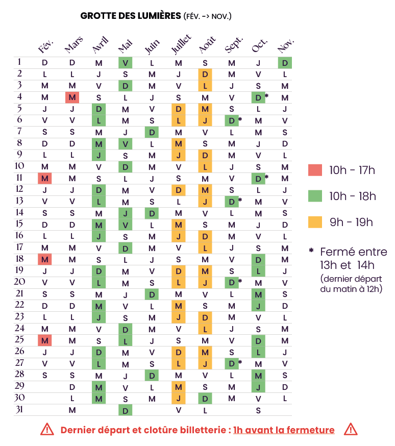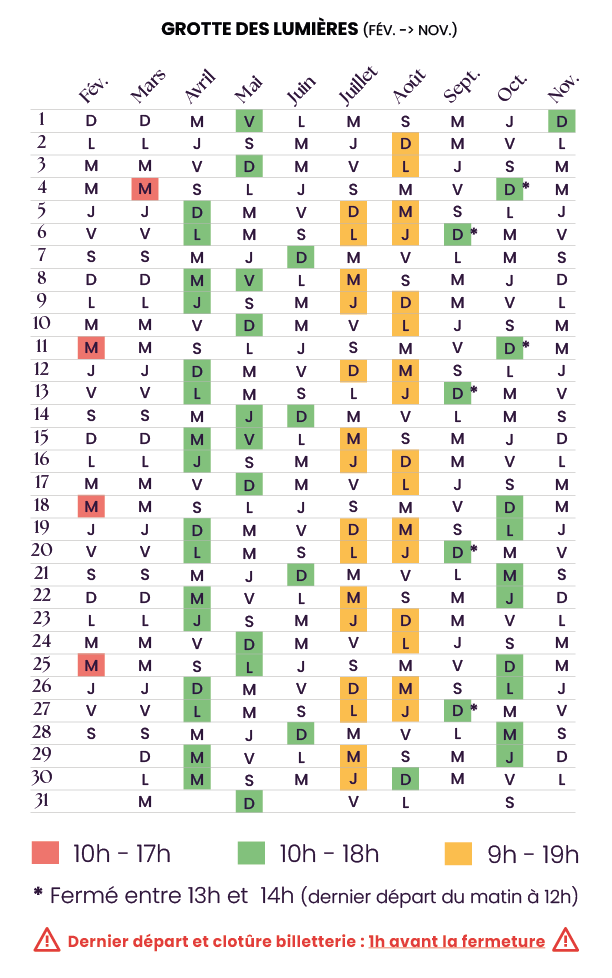 Calendrier Grotte des Lumières 2026